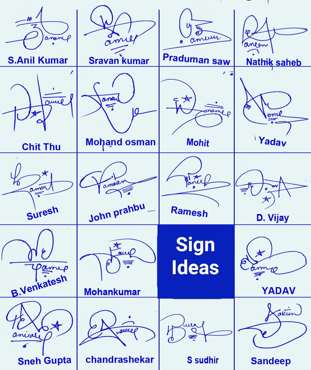 The grid above showcases real-world inspiration—swooping loops, star accents, bold initials, and smooth underlines. Notice how S. Anil Kumar uses an elongated first stroke as both letterform and underline, while Mohit adds a tiny star to anchor the design.