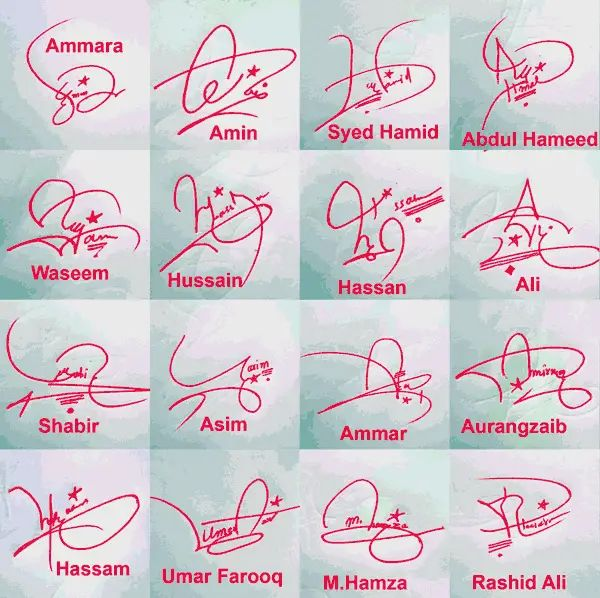 - Syed Hamid: Pink elegant script with connected letters and a subtle asterisk, great for formal online signatures.